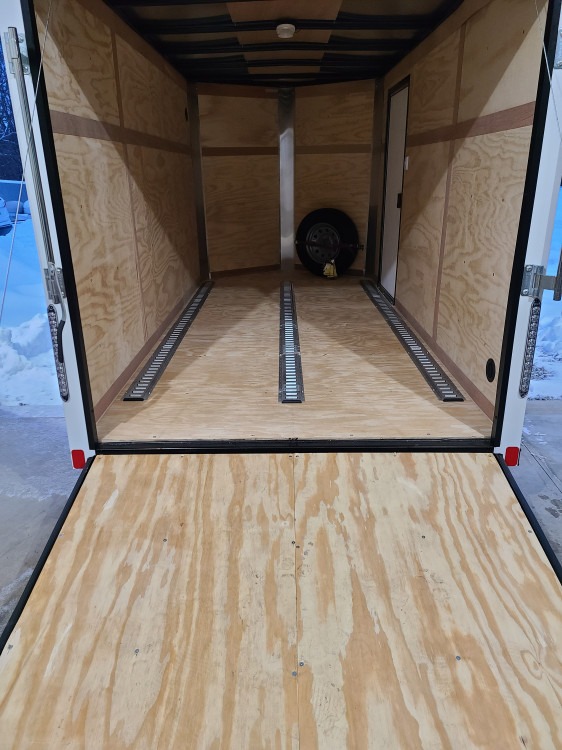 This enclosed is 6ft. by 12ft. and can hold up to 1,800 lbs. It has E track in the trailer for strapping down loose items. And it is set up with chocks for hauling motorcycles and dirt bikes. Trailers comes with a jack, spare tire and tire iron. Straps and pack blankets are also available upon request.